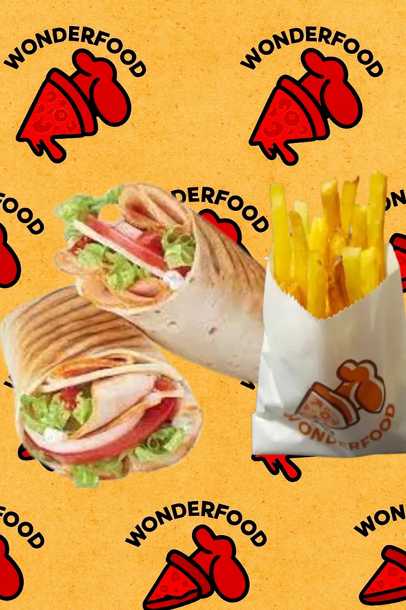 de harissa. Le tout enveloppé dans un pain pita moelleux, accompagné de frites