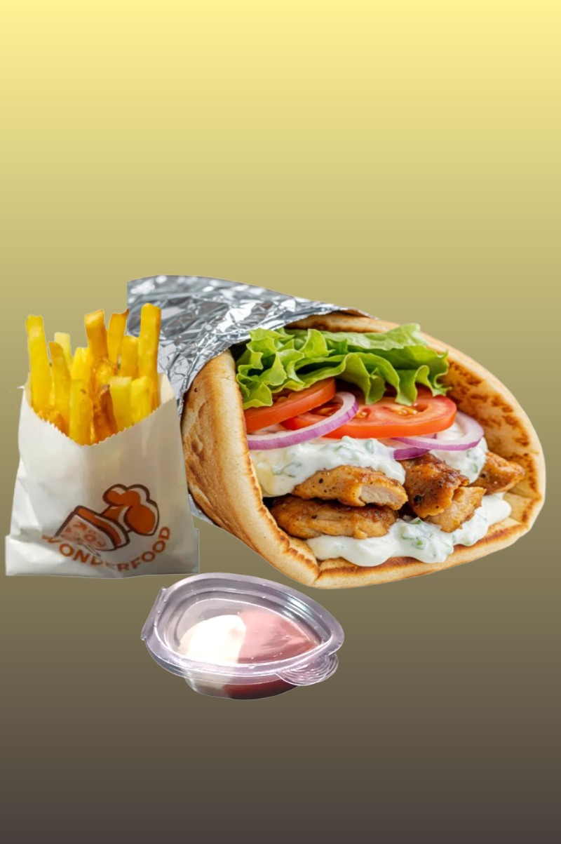 Makloub généreux à l’escalope grillée, accompagné de frites croquantes, salade verte fraîche,